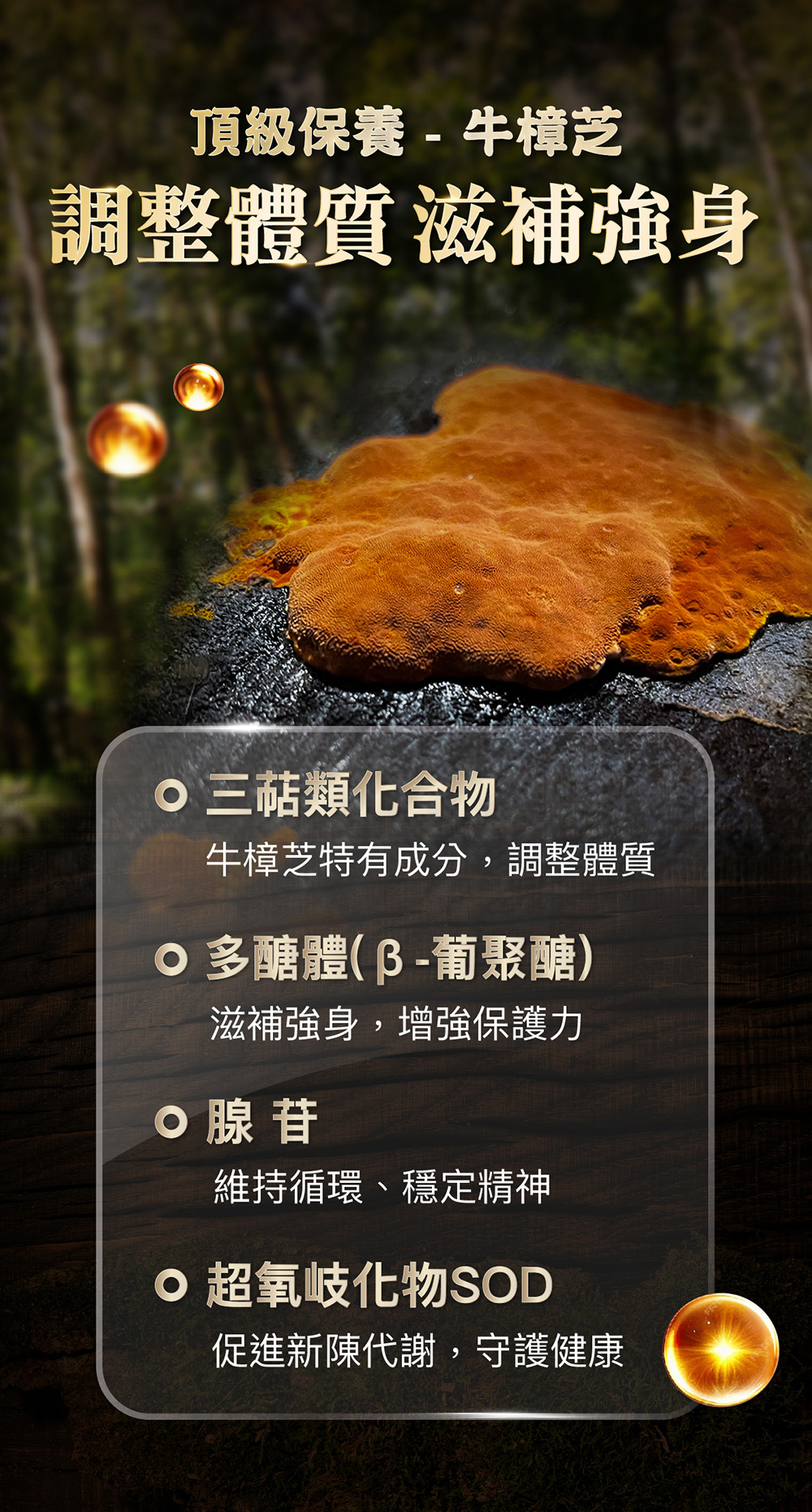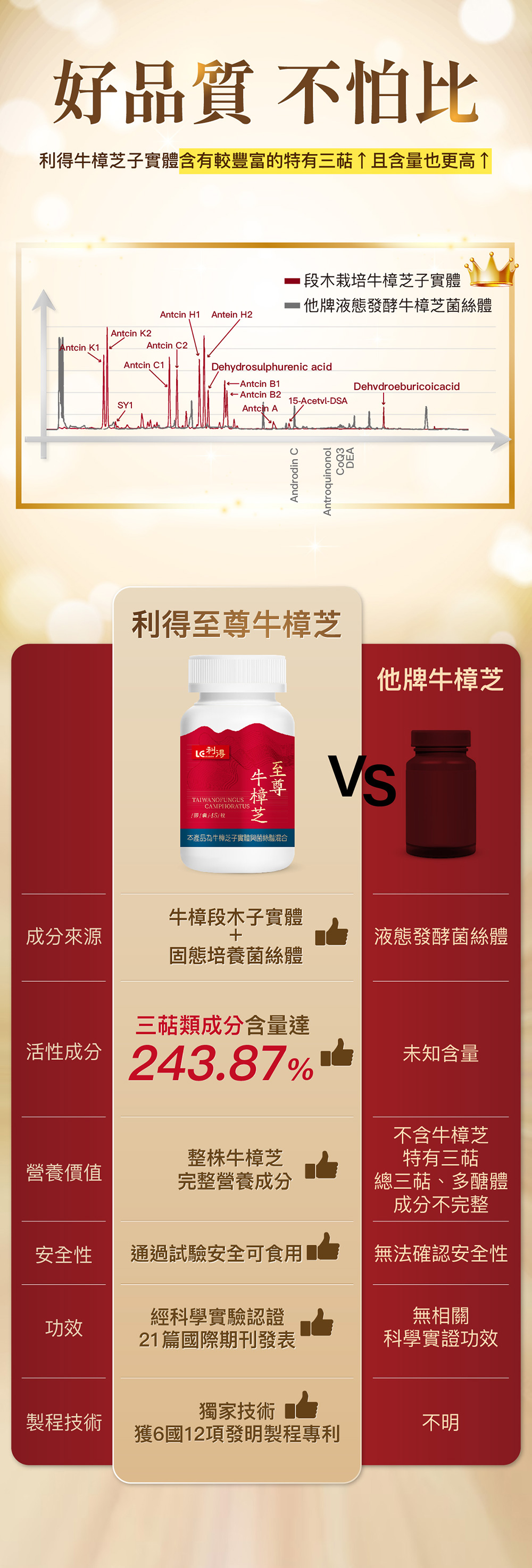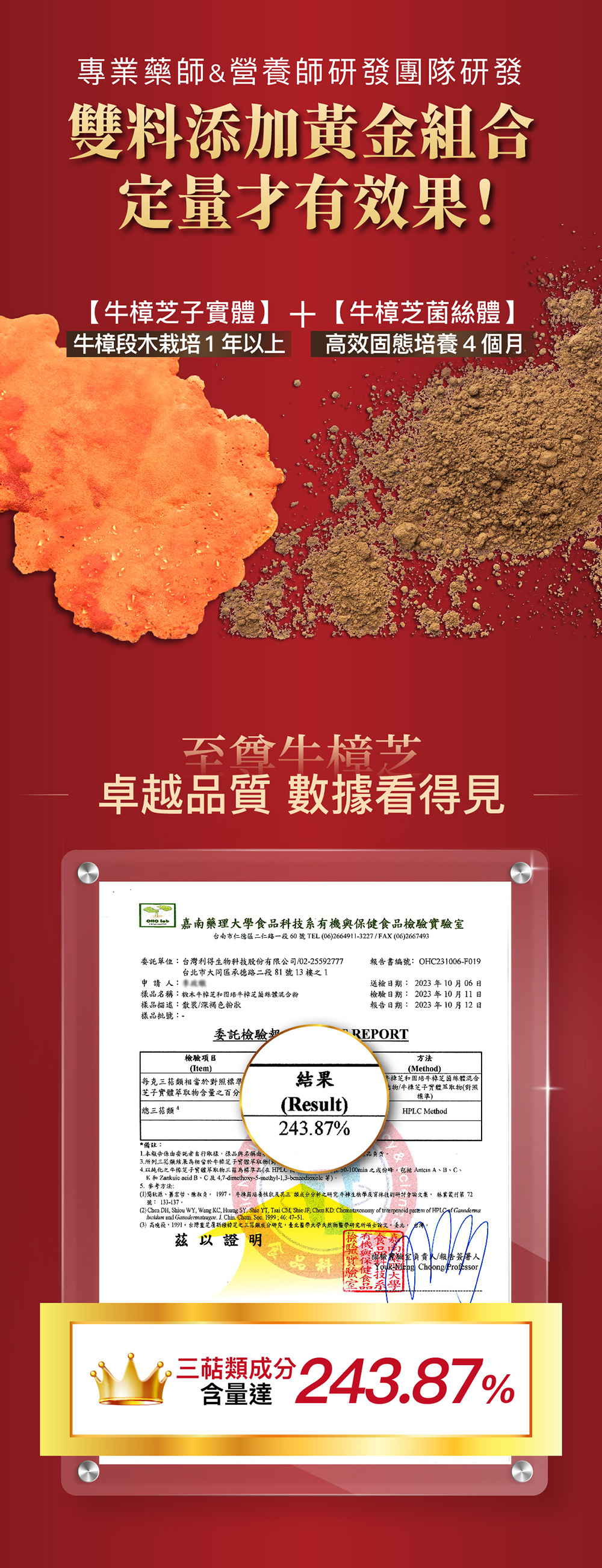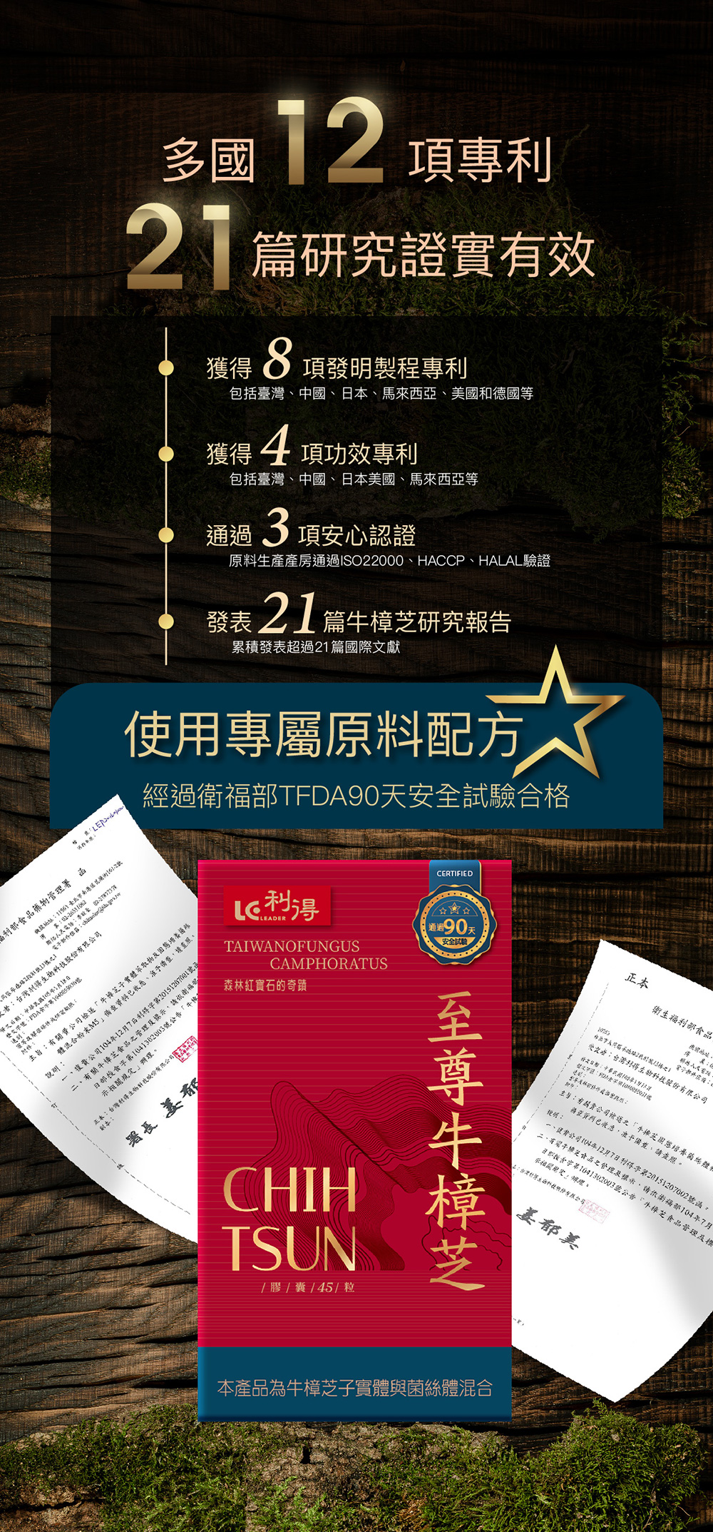 成分:固態培養牛樟芝菌絲體粉末、牛樟芝段木栽培牛樟芝子實體萃取物、硬脂酸鎂
